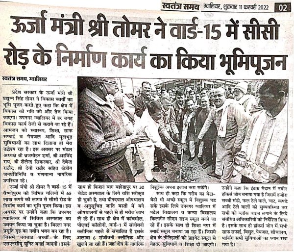 माननीय जी ग्वालियर जिले के उपनगर ग्वालियर में वार्ड क्रमांक 15 में सीसी रोड का भूमिपूजन किये।