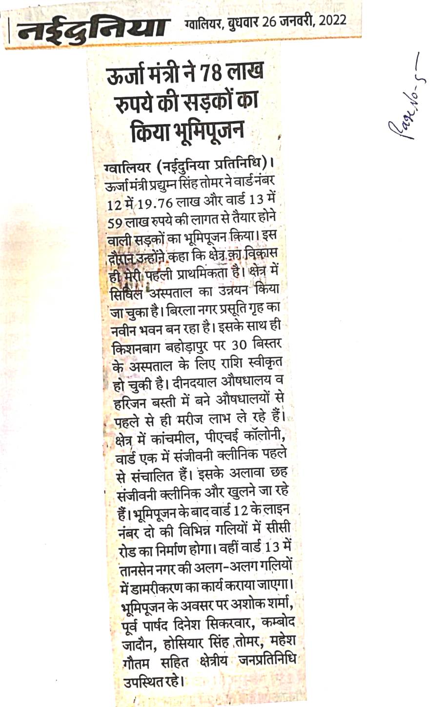 माननीय जी ने ग्वालियर जिले के उपगनगर ग्वालियर में सडकों के निर्माण का भूमि पूजन किये।...