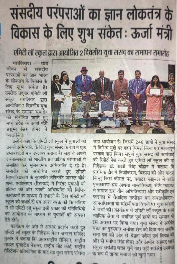 एमिटी लॉ स्कूल ग्वालियर द्वारा आयोजित की गई दो दिवसीय #युवा_संसद कार्यक्रम के दौरान।...