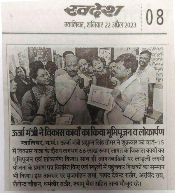 वार्ड क्रमांक 15 में विकास यात्रा के दौरान आंगनवाडी केन्द्र पर लाडली लक्ष्मी योजना के प्रमाण पत्र वितरित किए।...