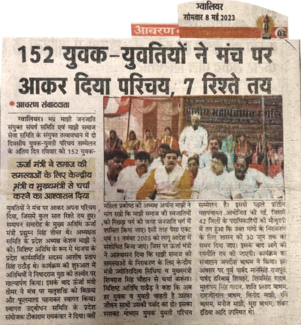 ग्वालियर के फूलबाग स्थित मानस भवन में मांझी समाज के युबक -युवती परिचय सम्मेलन में शामिल हुआ और समाज की ...